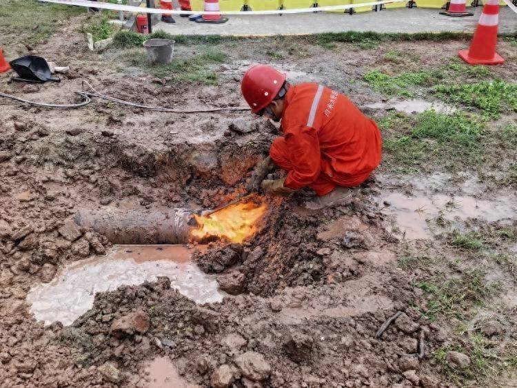 工人现场切割破损管道。