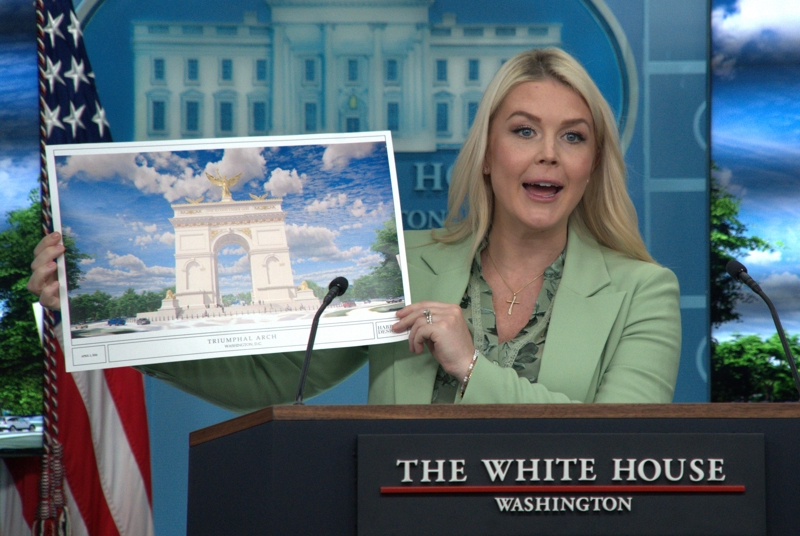 4月15日,在美国首都华盛顿白宫,白宫新闻秘书莱维特在记者会上展示拟建“凯旋门”的效果图。美国总统特朗普今年2月初宣布,计划在首都华盛顿林肯纪念堂附近建造一座巨型拱门,以纪念美国独立250周年。白宫新闻秘书莱维特4月15日在记者会上展示了这座“凯旋门”效果图,并称它是“为每个美国人而建”。\n 新华社发(李源清摄)
