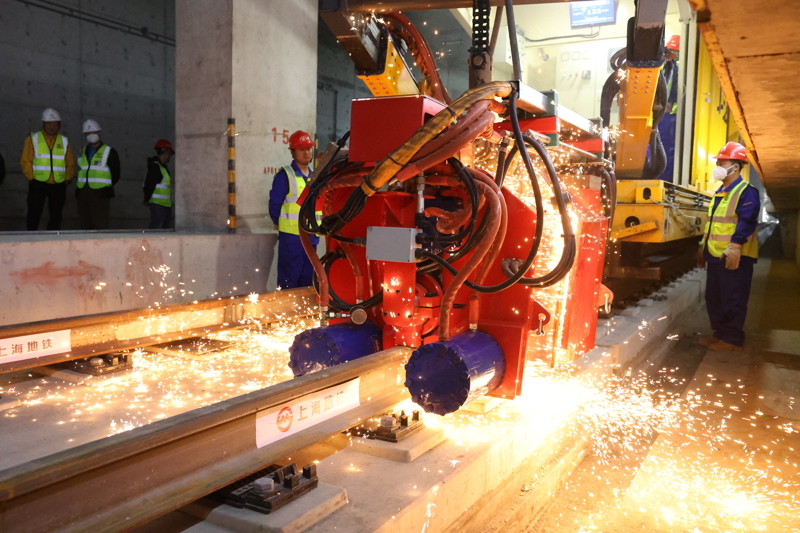 2026年4月21日上午,在建地铁崇明岛陈家镇车站内,随着中铁五局作业人员完成最后一对钢轨接头焊接,宣告上海首条穿越长江的轨道交通工程——上海轨道交通22号线(崇明线)正式实现全线轨道贯通。 解放日报记者 李茂君 摄
