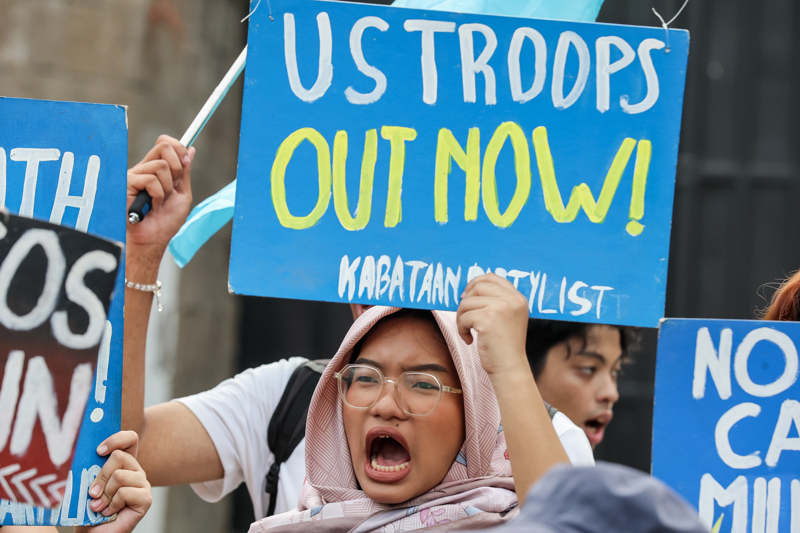 4月20日,民众手持标语在菲律宾武装部队总部外集会抗议。 新华社发(乌马利摄)