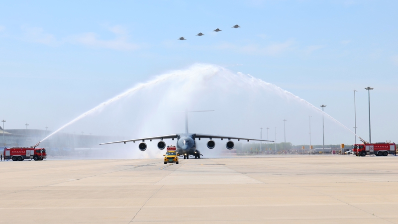 4月22日,接迎志愿军烈士遗骸回国的空军运-20B平稳降落沈阳桃仙国际机场,机场以航空最高礼仪“过水门”仪式为志愿军烈士英灵洗尘。 新华社记者 杨青 摄