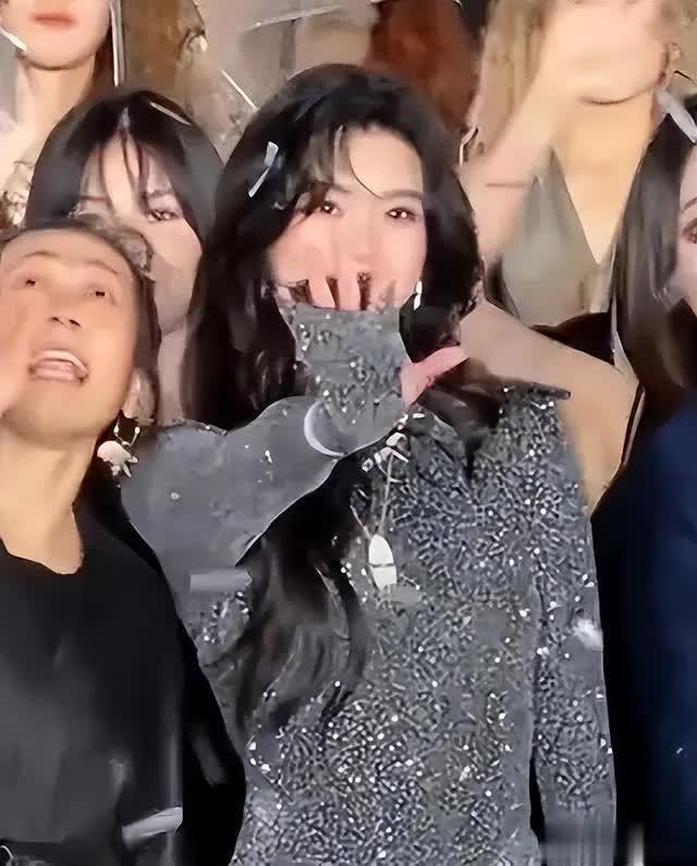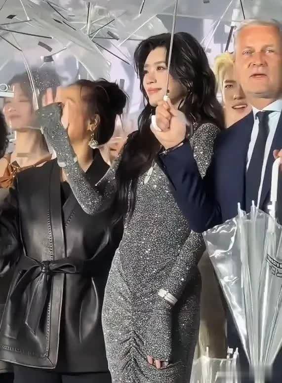 当天上海飘着细雨,秀场灯光打在红毯上,氛围感直接拉满,奚梦瑶一身银灰碎钻长裙亮相,178cm的身高把版型撑得利落又舒展。